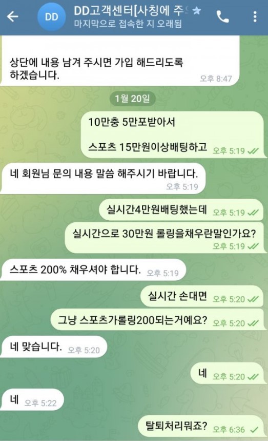 롤링문의하는데 계속엉뚱한소리하길래 찝찝해서 배팅진행중인거 25만원가량 있는상태에서 스폐샬당첨된금액 10만원만 먼저환전 눌렀는데 누르고몇분안되서 사이트팅기고 가족방강퇴 고객센터는 차단박아버리네요