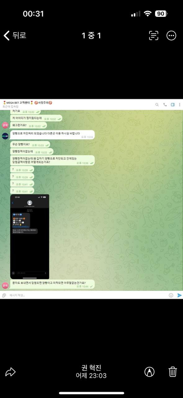 메가벳 먹튀사이트 입니다 당첨되서 들어가니까 아이디 차단해놓고 고객센터 문의하니까 양방배팅이라고 한마디하고 답도안하고 차단 삭제해버리네요..