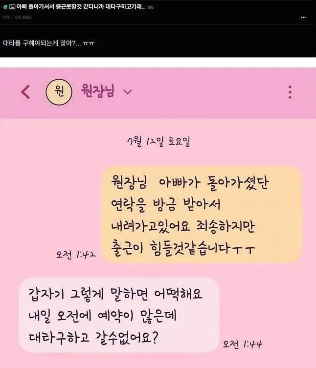 아빠 돌아가셔서 출근 못할거 같다니까