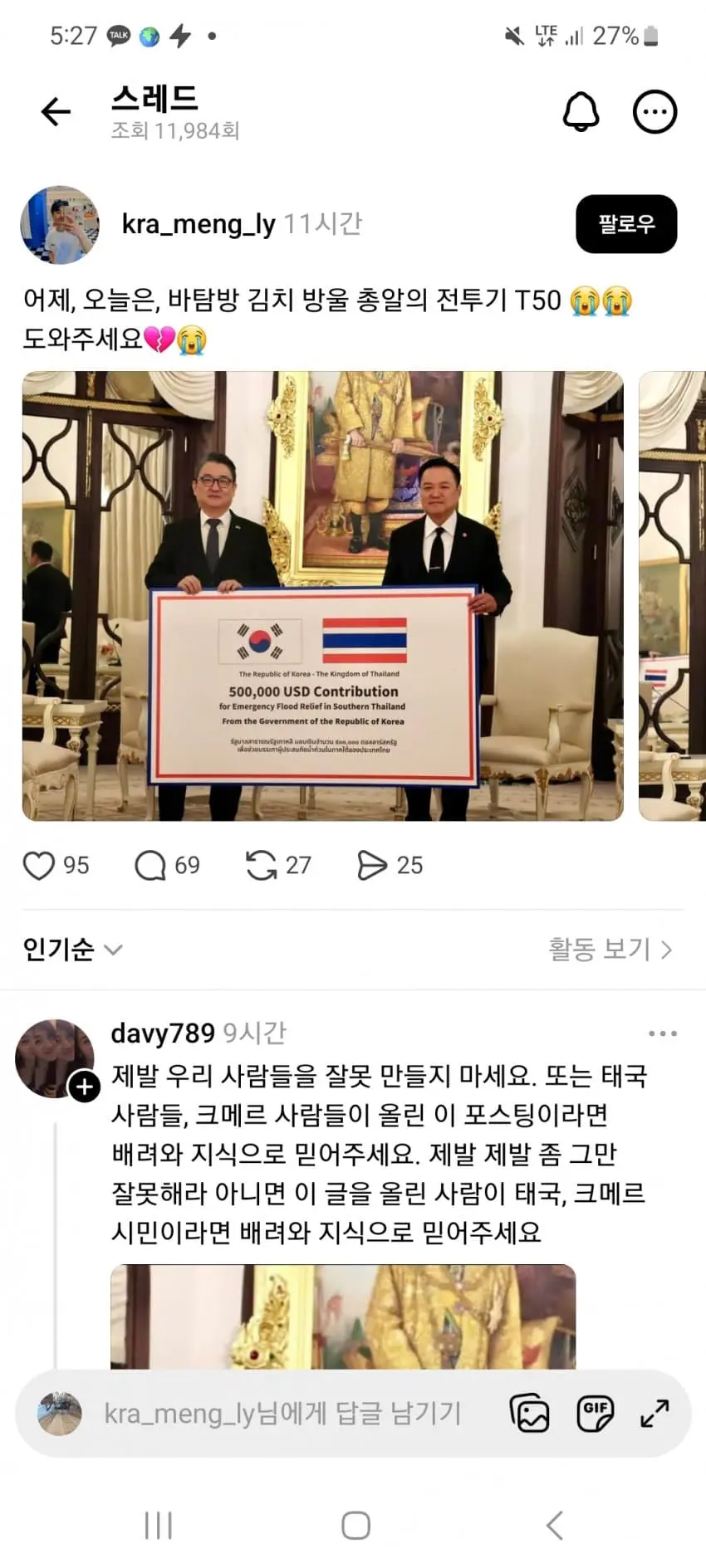 태국 수해 지원금을 주는 장면이다. 보이스피싱의 나라답게 주작밖에 못하는...