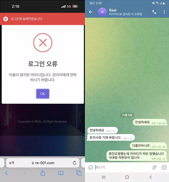 리얼 re-001.com 스포츠 및 바카라 배팅하며 게속 잃다가 첫 환전 신청하니까 바로 차단 먹튀