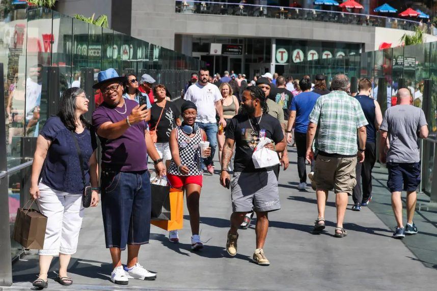 라스베거스 방문자 도착 네바다2023년 6월 29일 관광객들이 라스베이거스 스트립 육교에서 더위를 용감히 견디고 있습니다. 라스베이거스는 지난해 거의 4,100만 명의 방문객을 맞이했습니다. (이미지 : Las Vegas Review-Journal )